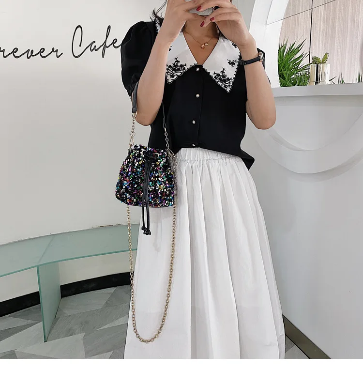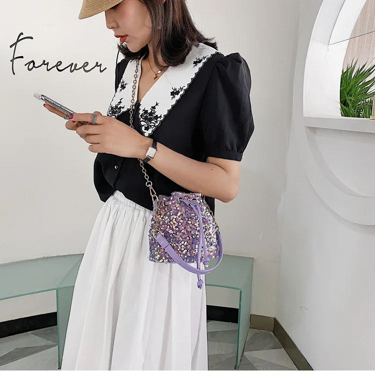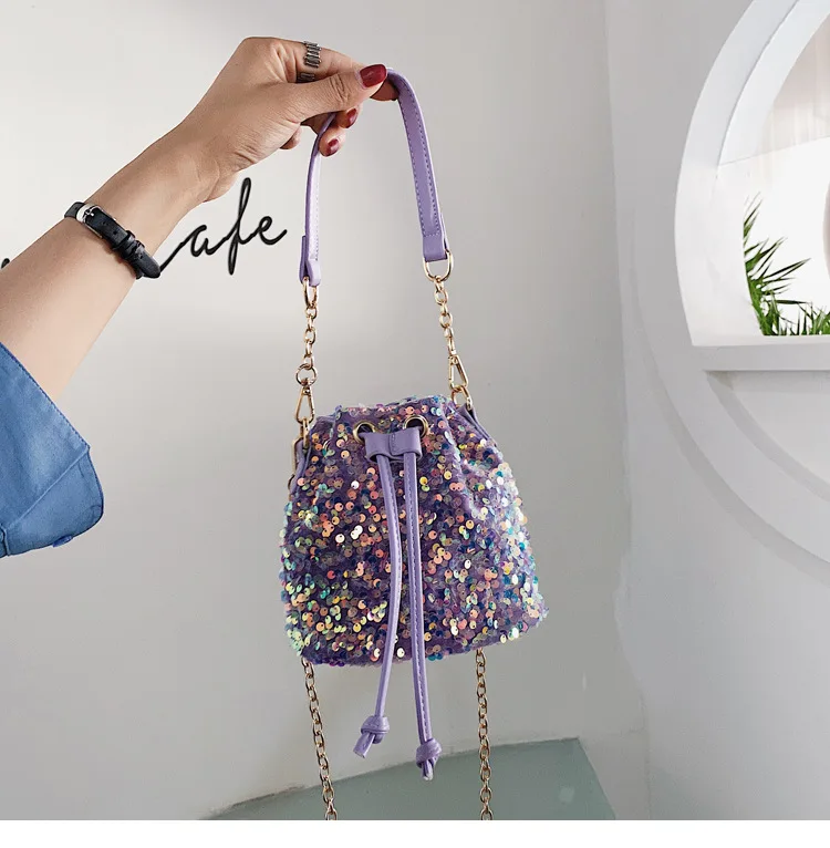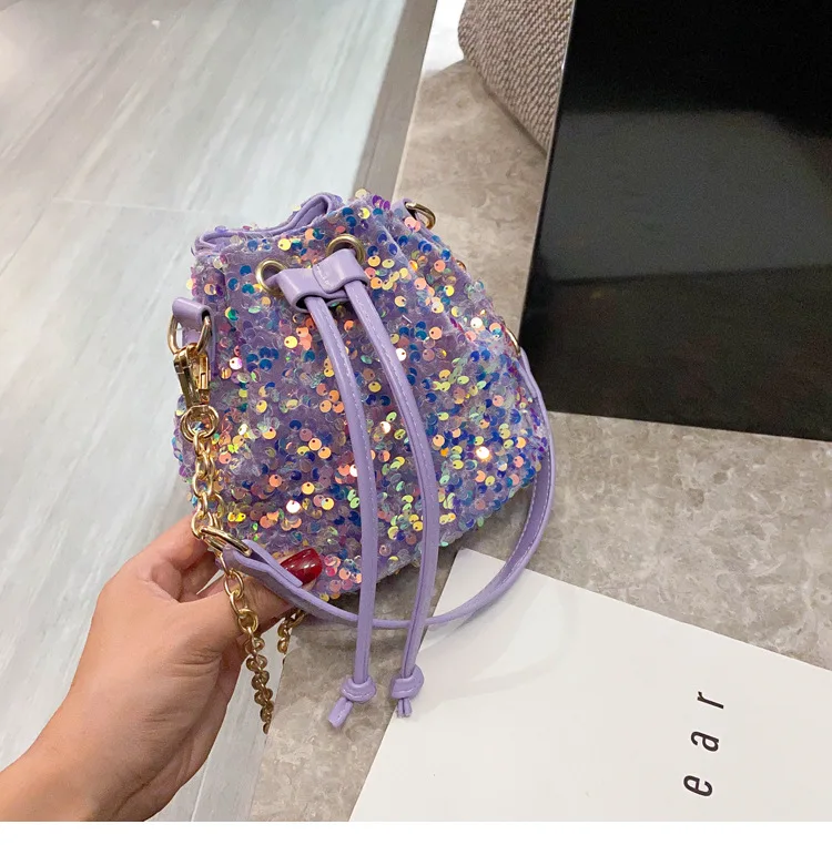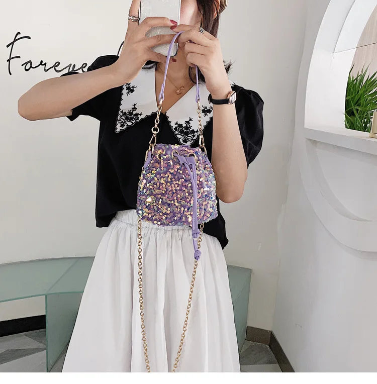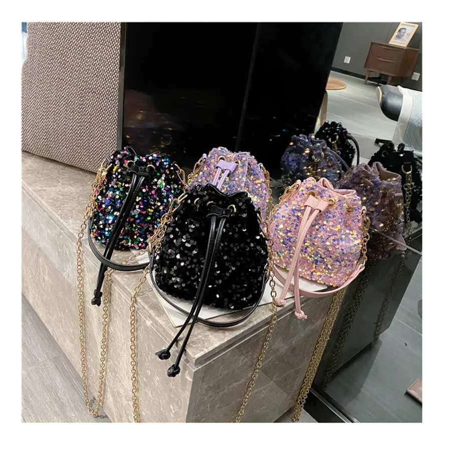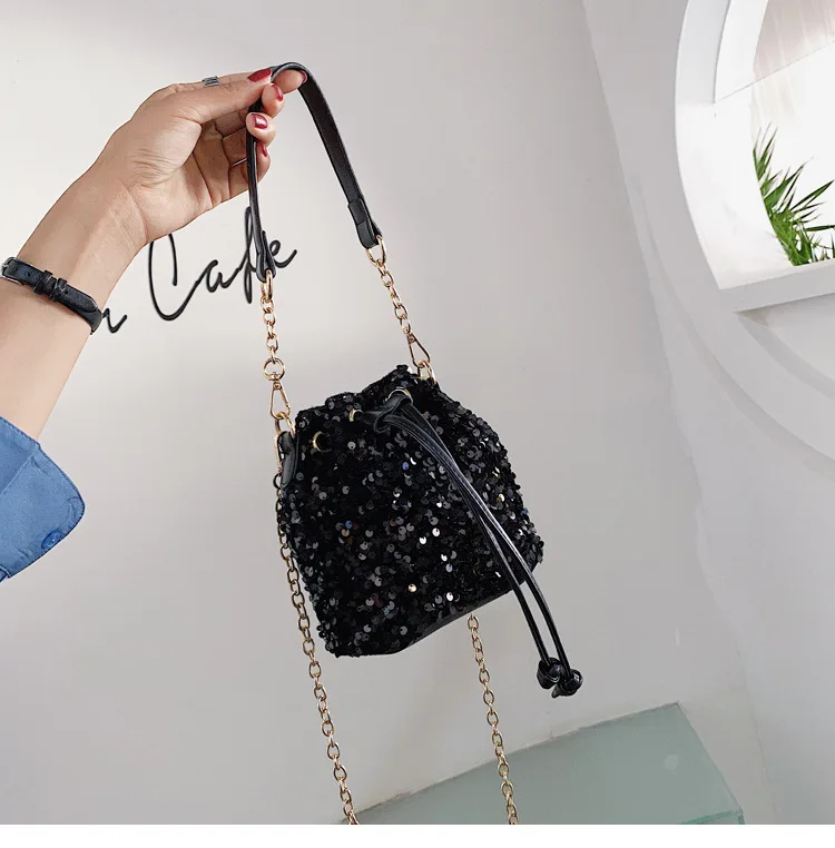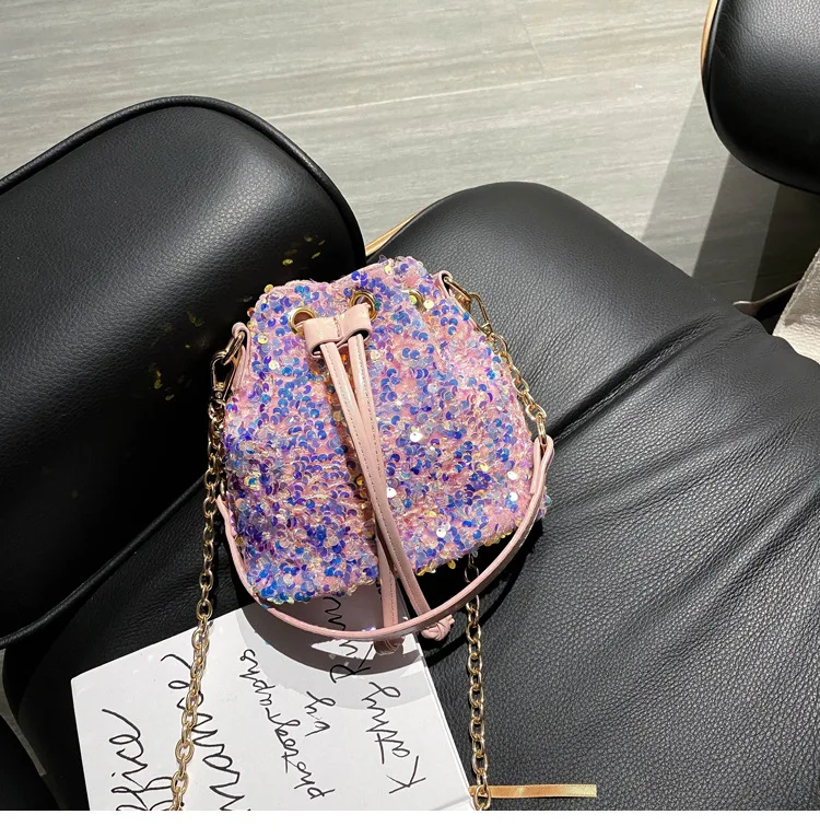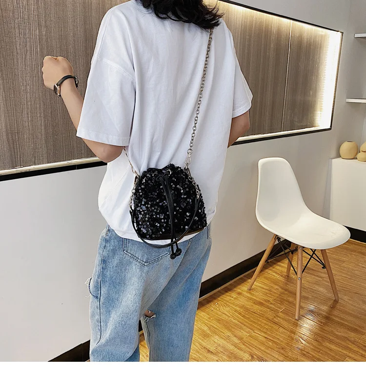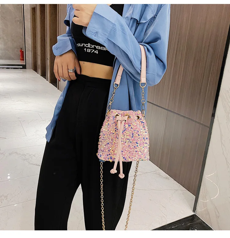 Women Fashion Sequin Drawstring Chain Shoulder HandBag Simple Pumping Mini Bling Bucket Purses Ladies
