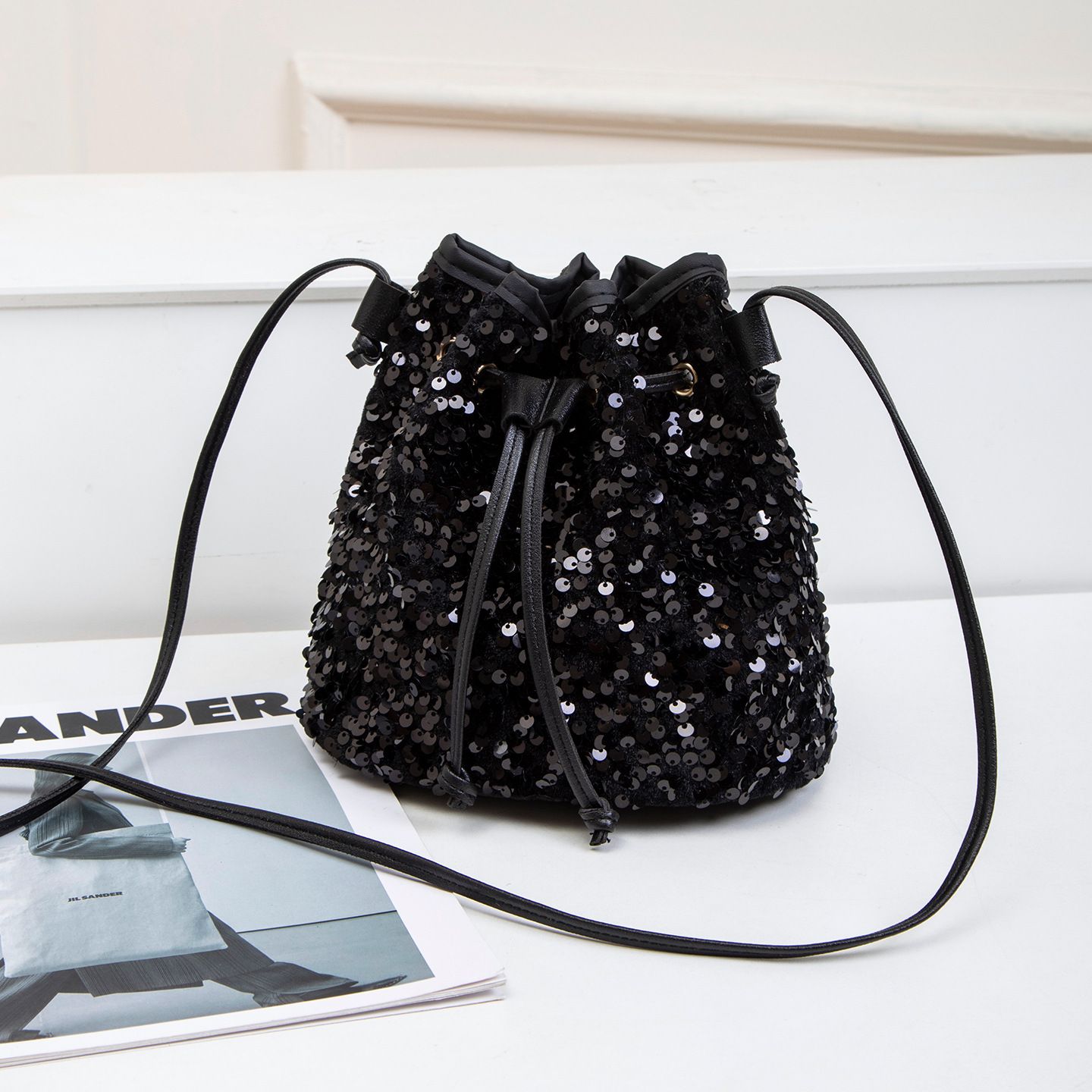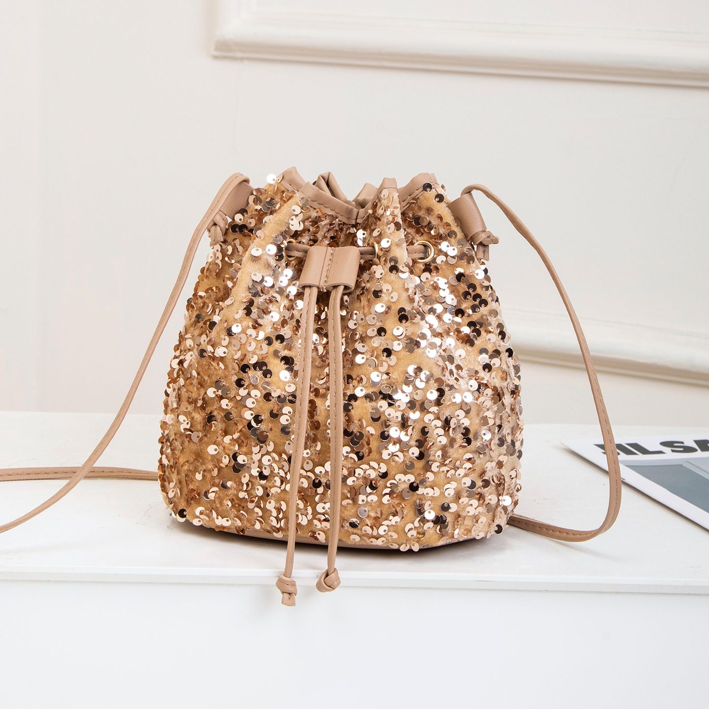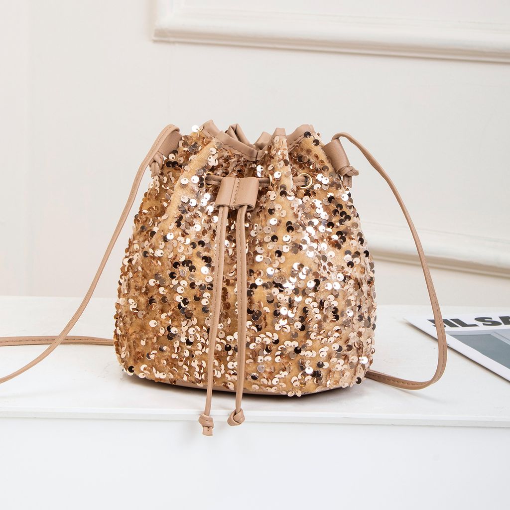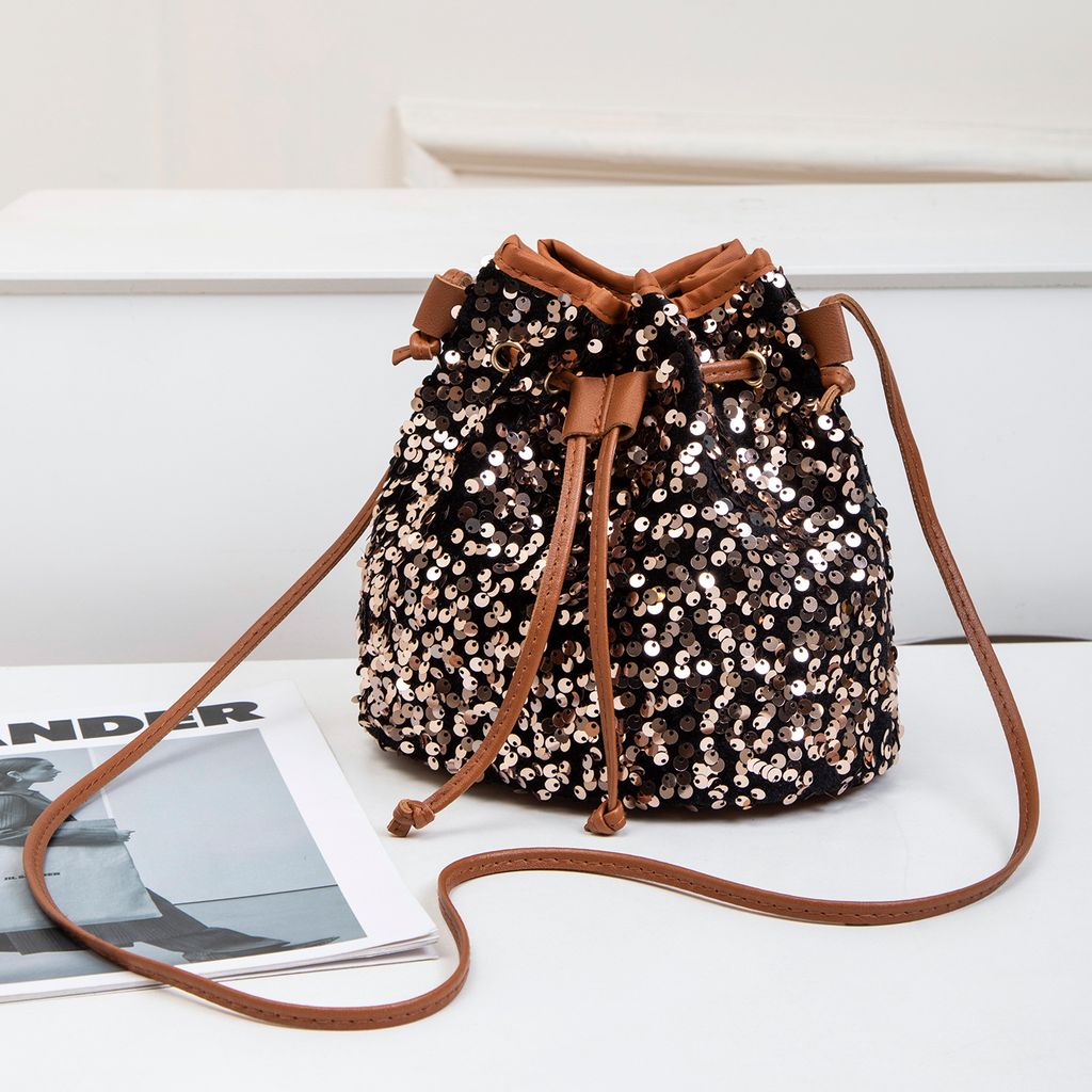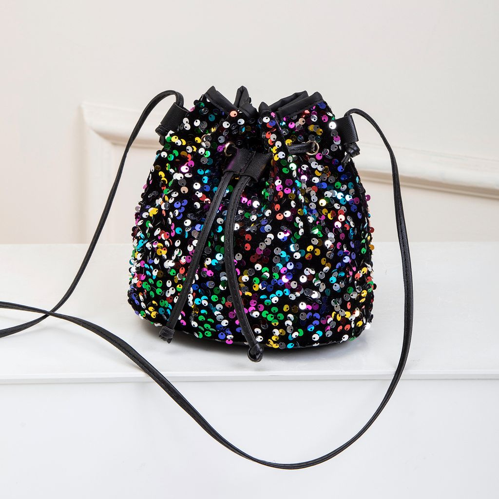 Women Fashion Sequin Drawstring Chain Shoulder HandBag Simple Pumping Mini Bling Bucket Purses Ladies